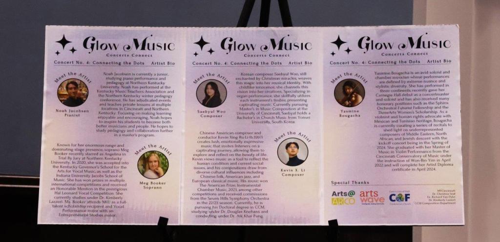 People kept coming in, and we constantly had to put more chairs! We had a variety of audiences. There were performers’ family members and professors, Glow Music’s regular VIPs :), a MYCincinnati student and parent, and followers of ARCO events! Together we had more than 50 people in the audience.